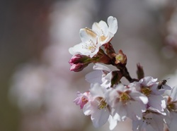 アンズ、桜に似る花姿、しかし花つきの様は異なる。桜花は枝から花軸が延び、枝と花に隙間が形成される。その背に空の青が映ると花姿が際立つ(下の桜をご参照)。一方アンズは花が枝に密接する、その分江田に取り付く花密度が高く、豪勢。