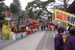 七福神めぐりに合わせてテント販売店(左)が特別限定開催されている。目玉は銀杏つかみ取り(400円)、熊本栗を贅沢に練り込んだ饅頭(1400円くらい?)。中央は鐘楼、近隣一帯、南平(部族民が住む)まで明け六つ、暮六つの鐘を響かせる(時刻は日本標準時です)。