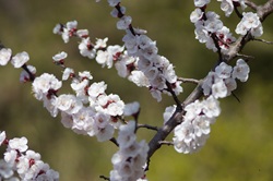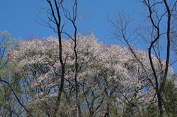 アンズ、桜に似る花姿、しかし花つきの様は異なる。桜花は枝から花軸が延び、枝と花に隙間が形成される。その背に空の青が映ると花姿が際立つ(下の桜をご参照)。一方アンズは花が枝に密接する、その分江田に取り付く花密度が高く、豪勢。