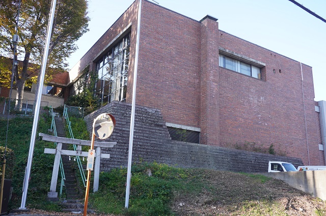 左は玄関脇の赤レンガ自販機。なぜ赤レンガが外装か?疑問の答えは文化財の玄関脇に剥き出し自販機は似合わない、こっちも文化財の姿に揃えようとの美学が(図書館側に)働いたから。右は館の裏側(浅川向き)、大谷石の擁壁の上の幅広い外壁は圧巻。どこか文化国家の大使館風情が漂う。左の鳥居は奥の八幡神社への参道、図書館裏口にもつながる。