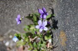 スミレ、石段の脇に咲いていた。本個体は「さく果」に花弁が露出するので「スミレ」