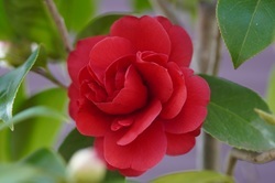 春の花ならツバキ(椿)濃い赤、(多くは)八重の厚い姿は、大人しい色姿の春花には異質。愛でるお人が多い中、忌避する御仁もちらほらと聞く。「私も苦手」とは撮影者。