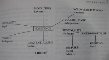 ラカン精神分析によるキルケゴール解体 下 (HP) ラカンは続ける、キルケゴールは自由を得られない; Kierkegaard veut échapper à des problèmes qui sont précisément ceux de son ascension à un ordre nouveau, et il rencontre le barrage de ses réminiscences, de ce qu’il croit être et de ce qu’il sait qu’il ne pourra pas devenir. Il essaie alors de faire l’expérience de la répétition> (110頁) 訳:キルケゴールは問題からの逃避を望んだ。その取り組みがなにより、新しい段階への上昇 « ascension » を約するものであったのだし。そうした存在であるべき、こうなってはならないと想起 « réminiscences » が教えるが、障害が必ず立ちはだかる。故に(進歩なし、同じ段階で)蹉跌を繰り返し失敗を重ねる。 著作 « Répétition » 繰り返しで綴られるベルリンへの再訪、かつての輝かしい体験を得られなかったキルケゴール。第2舞台で繰り返し挑戦が失敗の原因、ラカンはかく「昇天できなかった」と表現した。 引用したDictionnaire Philo.は「実存主義」からの解釈で罪を覚知し自由を得る過程を説明するが、ラカンは精神分析の手法として「想起」を持ち出している。 ラカン解釈でキルケゴールは3への上昇は至らなかった。用いた言葉 « ascension » を昇天とする。この語の大文字で始まる « Ascension » は「昇天祭」キリストが天に帰った日です。これをして第2段階でうごめき、蹉跌を繰り返し第3には上昇できなかった根拠とします。 ラカン精神分析によるキルケゴール解体 4の了(2022年7月13日) ラカン精神分析によるキルケゴール解体 5 (2022年7月15日)キルケゴールは神との対話と罪の自覚を語る。ラカンは彼を精神分析から解体する。 <L’inconscience est le discours de l’autre. Ce discours de l’autre, ce n’est pas le discours de l’autre abstrait, de l’autre dans la dyade, de mon correspondant, ni même simplement de mon esclave, c’est le discours du circuit dans lequel je suis intégré. J’en suis un de chaînons. Le discours de mon père, en tant que mon père a commis des fautes que je suis condamné à reproduire ― c’est ce que l’on appelle super-ego. Je suis condamné les reproduire parce qu’il faut que je reprenne le discours qu’il m’a légué, non pas simplement que je suis son fils, mais parce qu’on n’arrête pas la chaine du discours, et que je suis justement chargé de transmettre dans sa forme aberrante à quelqu’un d’autre. 訳:他者との対話が無意識に留められる。他者とは漠然とした他人ではなく、下僕でもなく, «dyade » 二重性に封じ込められている私の交信者であり、彼との対話は周回しその輪に私は取り込まれている。一つの歯車 « chaînon » にしか私は過ぎない。父が罪を犯したのなら、私はその罪を繰り返す運命に呪われるを知る。(知らされる前に気付いている自我)それが「超自我」である。「超自我」が強いる対話を私は続けなければならない。私が父の息子であるという単純な理由からではない。この連鎖を人が止めてはならない。この連鎖が辻褄の合わないものであろうと、誰かに引き継がせねばならないからだ(112頁)。 プラトンの前世記憶をラカンは巧みに応用する。ここでの交信者 « dyade » は当然、プラトン主唱の « âme » 心―の考えを踏襲しているが、精神分析の視点から心理の累層とは自覚する心と自覚しない心の間の対話とラカンは説明する。すると « c’est le discours du circuit dans lequel je suis intégré » その内部に私が封じ込められている、周回する対話―の意味が理解できる。 自覚している側、私« égo » は、自覚されない側は « super-égo » と累層並立し、対話は無意識のままに成り立つ。私自身は自覚していない« super-égo »を入れる容器 « contenant » に過ぎない。私の精神の中身 « contenu » は« super-égo » が持つ。« super-égo » は私を乗り越えて(容器を替えて)継続する。その本質は「罪」である(この文節は部族民解釈)。 プロテスタント思索者のキルケゴールと精神分析者カソリックのラカンとの接点は、人の本質は「罪」であり(フロイトではリビドー)、それを自覚し信仰によって開放される(精神分析の問診治療)。キルケゴールは自由を昇天とし、ラカンはそれを病んだ精神の快癒とする。 (本投稿ではフロイトの« principe » を原理と訳した。邦訳では「原則」が定番となっているようだ。辞書(スタンダード)は訳に原理原則を挙げるからどちらも可能となる。原則は例外が滑り込むのを甘受する―このような語感を感じ取る。2の « principe » をラカンが持ち出したのはHyppoliteが「フロイトにもダーウインと同じく« principe » を立てて論を展開している」との指摘を受けてから。ダーウインの淘汰原理にフロイト説をなぞらえるならこちらも原理と考えた) ラカン精神分析によるキルケゴール解体 5の了(2022年7月15日) ラカン精神分析によるキルケゴール解体 6 最終 (2022年7月18日)最終にあたりキルケゴールが今、哲学思潮の中でどのように評価されているか、実存主義との関連から小理解を述べたい。 上写真はDictionnaire de Philosophie (Nathan社版)の実存主義説明ページから拝借した図です。中央 «Existence » の意味を「実存」
