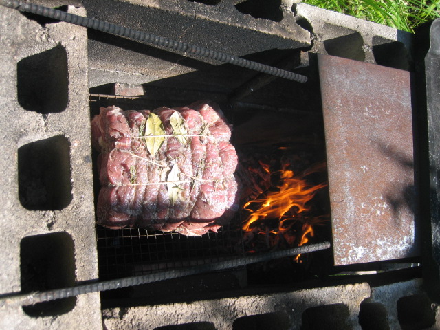 第2回投稿 牛の丸焼き (2019年7月15日) 牛の一頭は諸般の事情で手に入らない。入ったとしたところで先立つモノが無いから買える訳など無い。 近辺スーパーを視察するとロース肉が安い。 肩ロースなる部位、固いし筋が入っているから ステーキには向かない。 そんなら薪火で丸焼きすれば食える くらいにはなるか。 一部位限定、ビンボー人向けの丸焼きだ。 |