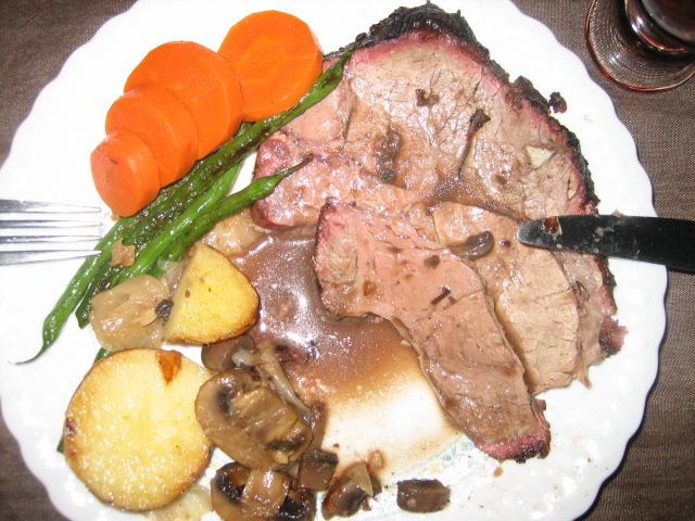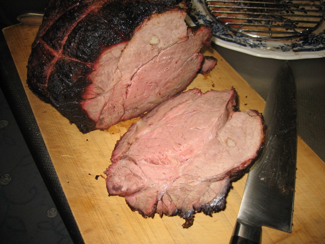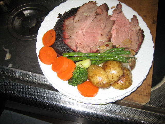焼き上がり、焦げ付きがでた。肉を買ったのが午前10時、焼き始めが2時。4時間では肉の中まで熱が通るまで時間がかかった。内部温度を63度にするとミディアムになる。1時間ほどアルミホイルで養生させる。 | |||